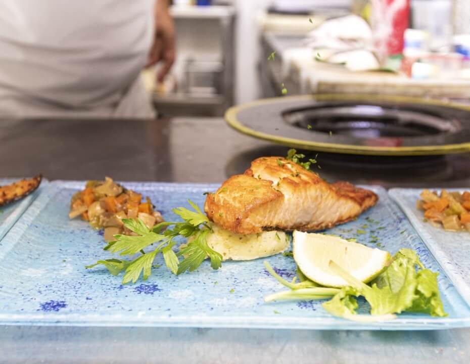 Grilled salmon served with green leaves and a fresh slice of lemon